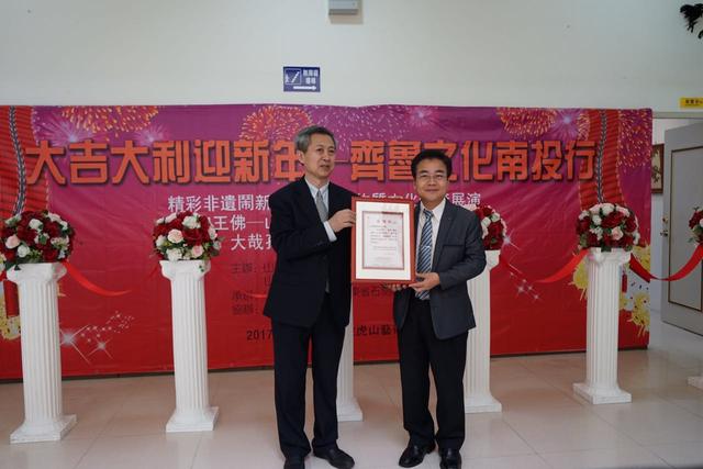 两岸一家亲,欢乐迎新年。为共同欢度2017年春节,促进两岸文化交流,山东非物质文化遗产保护协会、山东省海峡两岸经济文化发展促进会与南投县政府文化局合作举办的“大吉大利迎新年—齐鲁文化南投行”开幕活动余1月7日上午在南投县虎山艺术馆隆重举行。