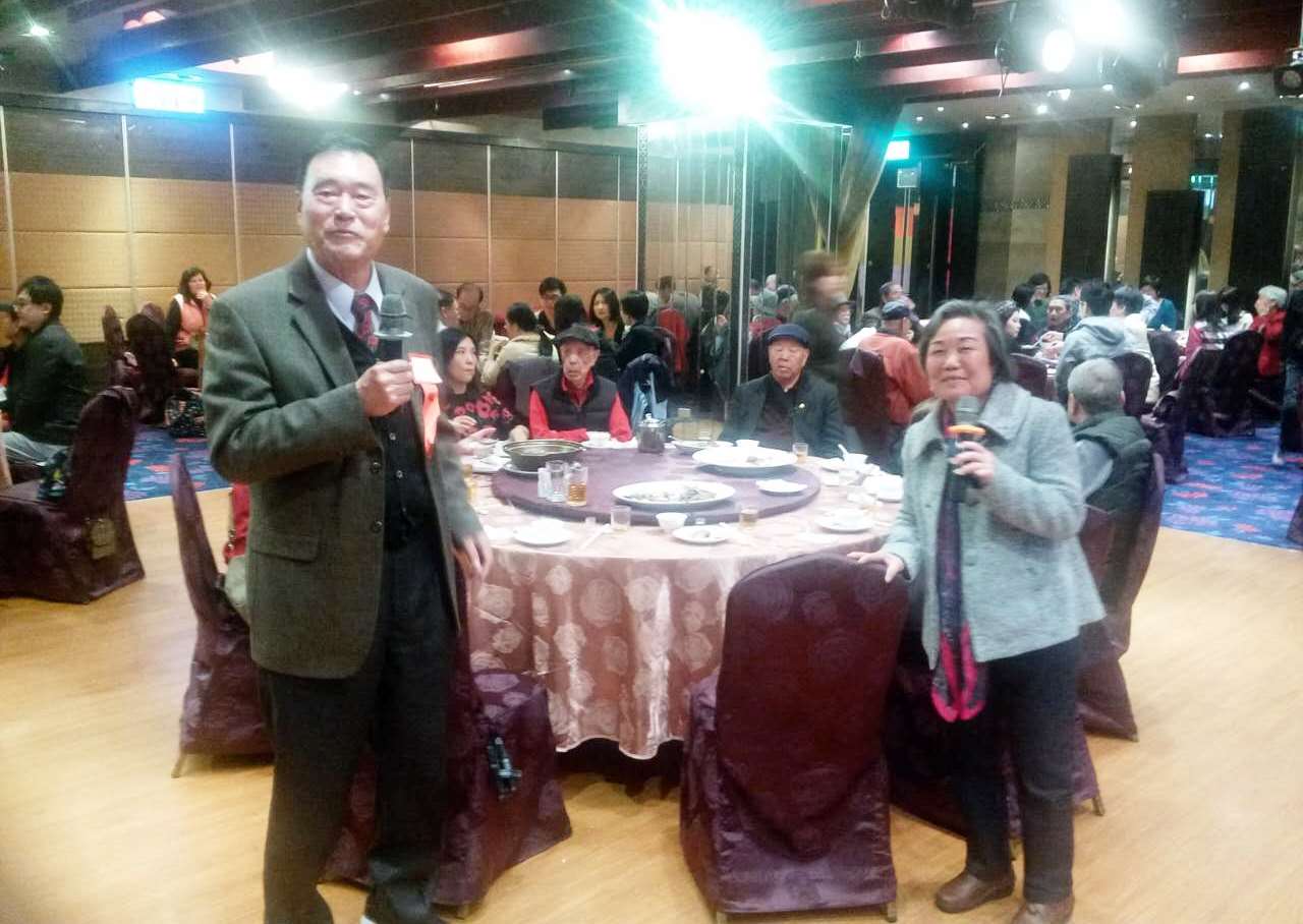 团拜聚餐,席开14桌,老中少尽兴欢唱,大家都怀念莱阳老家,有同乡用家乡话演唱,在欢乐中相互拜年和祝福。(中国台湾网、台北市山东莱阳同乡会联合报道)