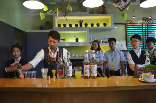 文化体验活动期间,正值2017年全国职业院校技能大赛(高职组)中餐主题宴会设计赛在学院进行,台湾大仁科技大学的师生们现场进行了赛事观摩,并在国际花式调酒冠军许博胜老师的带领下,在开放赛事中现场进行了花式调酒表演及咖啡冲泡展示,并为现场来宾们制作了精美的饮品,其精彩的表演和高超的技术得到了来宾们的一致称赞。