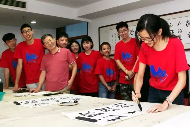 7月17日,海峡两岸大学生在山东青岛名家美术馆跟着书法家学习书法。