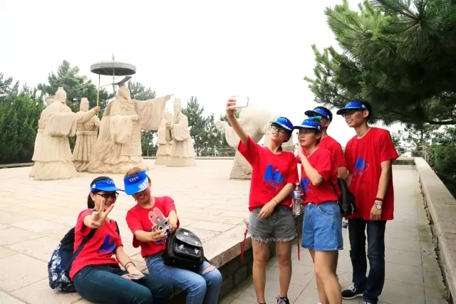 在青岛琅琊台秦始皇遣徐福入海求仙群雕旁,暑学营的学生模拟石像玩儿起了“穿越”。“今天我演了秦始皇,中国历史上是不是就有第二个女皇帝了。”来自中国石油大学(华东)的靳雅萱笑着说。