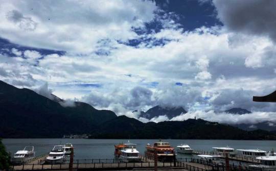 雨渐急了,我们也来到了山顶,准备乘缆车居高临下俯瞰日月潭全貌,浓重的雾气仿佛给日月潭披了一层面纱,朦朦胧胧中,日月潭的美丽若隐若现,在缆车里远观,却难识其庐山真面。但这却是一种别样的体验。,可能日月潭怕自己太美,只给我们管窥蠡测的机会,宛如一个害羞的新娘;也可能是台风从中做梗,不想让我们一睹其风采。下了缆车,我们有机会来到湖边,一两艘小艇泛舟水上,激起浪花,风吹过来,卷起层浪……极目远眺,这里虽无落霞孤鹜飞,秋水共长天的壮景,却以其温婉收纳人心。