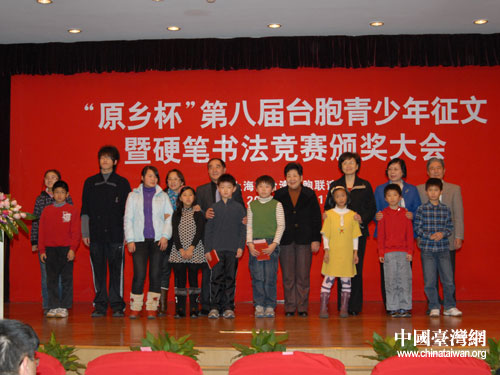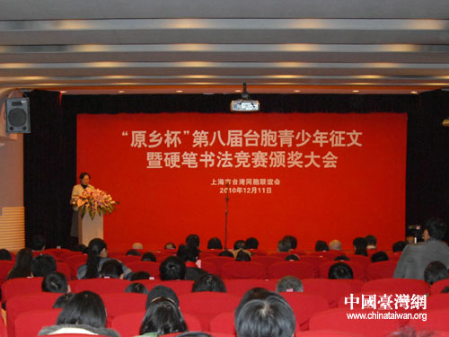 中国台湾网12月14日上海消息 日前,由上海市台湾同胞联谊会主办的“原乡杯”第八届台胞青少年征文硬笔书法竞赛颁奖暨上海市台联奖学金颁发大会在文新报业大厦举行,获奖学生及老师家长、各界领导嘉宾约300人分享了台胞青少年成功的喜悦。中共中央候补委员、全国台联副会长、上海市台联会长林明月,市委统战部副部长丁志坚,市台办副主任赵雅君等领导出席颁奖大会并为获奖学生颁奖。