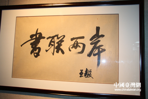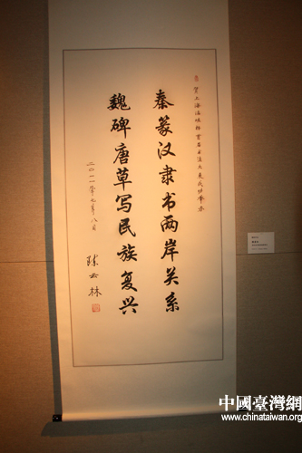 海协会会长陈云林书法作品“秦篆汉隶书两岸关系 魏碑唐草写民族复兴” (中国台湾网 李桂英 摄)