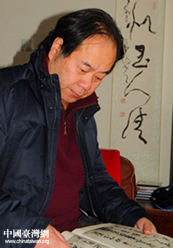 丁申阳阅读碑帖墨迹。(上海市台办 常志康 摄)