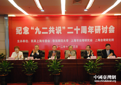 中国台湾网12月3日上海消息 今天上午,由民革上海市委、上海台湾研究所、上海市台湾研究会、华东师范大学交流与区域发展研究所联合举办的纪念“九二共识”二十周年研讨会在上海民主党派大厦举行。海协会原常务副会长唐树备、上海市台办副主任李雷鸣、华东师范大学副校长范军、中国国民党大陆事务委员会主任高辉,以及台湾前海基会副董事长兼秘书长邱进益等出席了会议。