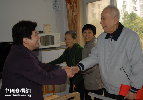 在静安区老年医院,林明月会长向护工了解郭炤烈名誉会长的身体状况,郭会长的女儿从日本打来国际长途,感谢市台联长期以来的关心和慰问。在老台胞林裕章家中,林明月会长回忆了上世纪八十年代由林老陪同返乡寻根的往事并与林老一起聊起了近期两岸关系的新进展。