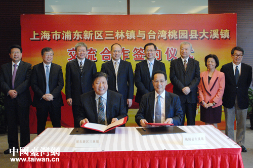 中国台湾网4月28日上海消息 4月27日,上海浦东新区三林镇与台湾桃园县大溪镇签署了民间文化交流合作备忘录。上海市政协副主席、浦东新区区长姜樑和台湾桃园县长吴志扬见证了签署仪式。