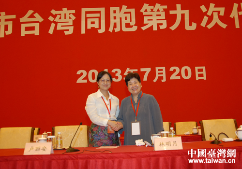 上海市台联八届理事会会长林明月(右)与市台联九届理事会新当选会长卢丽安。(上海市台联 王茜 摄)