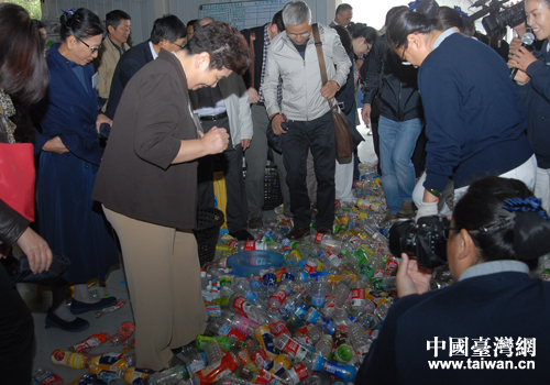 在环保实践功能区,慈济的志工们正在从事垃圾分类工作。在沪台籍人大代表、政协委员一边听着如何进行垃圾分类的介绍,一边实践踩踏空塑料瓶。空塑料瓶经踩踏压缩后可明显减少堆放所占用的空间。完成分类后,大部分垃圾都可以变为资源,回收再利用。实践功能区展示的以新鲜果皮、菜皮配红糖和水制作的酵素引起了不少代表、委员的兴趣。