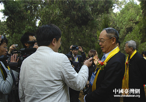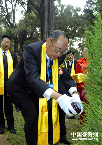 钱复先生将阿里山的土、日月潭的水洒在栽植的“同根同源”纪念树下。(图片来源:陕西省台办)