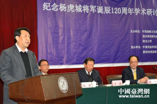 中国台湾网11月28日西安消息 日前,西安事变研究会、中国战略文化研究会、西北大学等联合主办了纪念杨虎城将军诞辰120周年学术研讨会。杨虎城将军的女儿杨振美、次孙杨瀚和来自海峡两岸各界专家学者出席研讨会。陕西省台办副巡视员陈一峰参加会议并致辞。