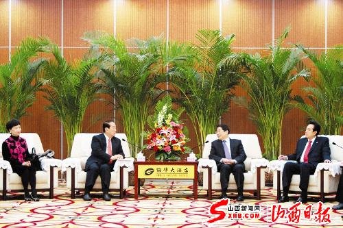袁纯清代表中共山西省委、省政府和3400万山西人民,对宋楚瑜一行来山西参访表示诚挚欢迎,对宋楚瑜多年来为两岸关系发展所作的贡献表示钦佩,并向宋楚瑜一行介绍了山西省情特点和经济社会发展情况。他说,2005年5月,宋主席的大陆沟通之旅,对推动两岸关系和平稳定发展,产生了重要影响。宋主席长期以来坚持“一个中国”,致力于两岸关系和平发展,积极推动两岸交流,令人赞赏和敬佩,相信宋主席此次来山西参访,将为晋台交流合作开辟新的篇章。他指出,五千年文明看山西,山西是中华民族重要发祥地之一,“地上”人文资源首屈一指,民族文化遗产丰厚,华夏民族的始祖黄帝和炎帝都曾在山西活动,尧舜禹均建都山西,现存宋、辽、金以前地面古建筑占大陆的70%以上,国家重点文物保护单位居全国之首。中原农耕文明和北方游牧文明在山西交汇,佛教文化、民俗文化、大院文化、根祖文化交相辉映,从中感受到中华文明的灿烂辉煌。山西“地下”资源十分丰富,煤炭储量占到全国储量的1/4,60多年来产煤120亿吨,外调90亿吨,占省际外调煤炭的70%,为大陆经济发展作出了重要贡献。近年来,山西经济持续快速发展,新兴产业加快壮大,综合实力不断增强,社会事业全面进步,人民生活水平显著提高,三晋大地焕发出勃勃生机。特别是我们坚持以科学发展观为指导,抓住国家把山西确定为资源型经济转型综合配套改革试验区的难得机遇,以转型跨越发展为主线,以煤为基、多元发展,推进煤炭资源整合和企业兼并重组,做好地上地下两篇文章,促进煤与非煤产业协调发展,努力在“十二五”期间再造一个新山西。