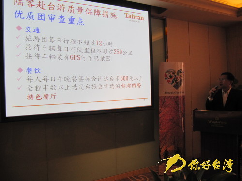 如何确保赴台游的品质?台旅会北京办事处主任杨瑞宗在座谈会上首推赴台游优质行程。所谓优质团的标准,台旅会将从行程、交通、住宿、餐厅、购物等5个面向订出相关规定,作为未来审核之标准,包括旅游团每天行程不得超过12小时、所搭乘游览车大巴行驶里程不得超过250公里,且要提供装有GPS行车纪录器之大巴租车契约、午晚餐合计餐标需达500元台币以上、全程三分之一天数须入住星级旅馆、且全程无安排特定购物商店,或购物商店总数不超过全程总夜数、高单价购物行程只能安排一站,若走环岛行程,花东可再加一站购物店。