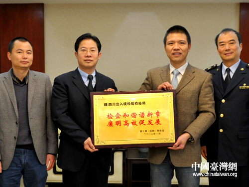 中国台湾网2月7日成都消息 日前,成都富士康公司代表竹奇俊先生向四川检验检疫局赠送了“检企和谐谱新章、廉明高效促发展”牌匾,感谢检验检疫部门在为富士康产业转移和进出口业务中所提供的科学监管和热情服务。