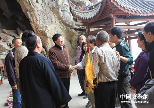 陈福林一行与台湾游客在乾元山金光洞前合影留念。(图片来源:绵阳市台办)