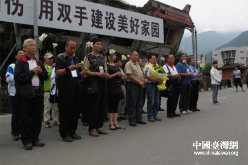 参访团一行在北川老县城悼念遇难同胞。(图片来源:四川省台办)