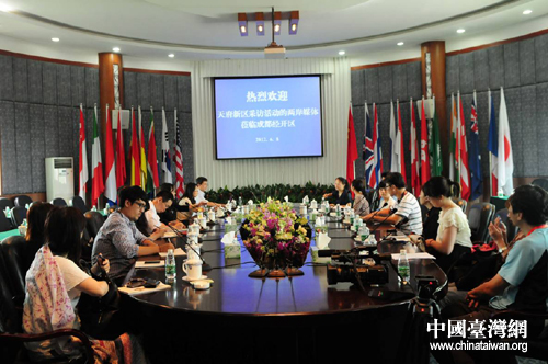 参加天府新区采访活动的两岸媒体记者在成都经济技术开发区座谈采访。(图片来源:四川省台办)