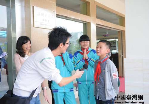 《两岸爱心地图》采访组在都江堰采访顶新新建小学学生。(图片来源:四川省台办)