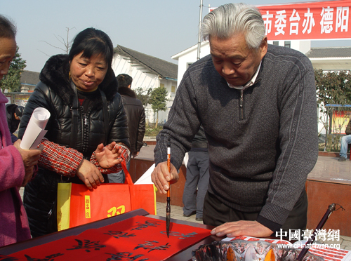 在活动现场,德阳市台办、市台胞台属联谊会的工作人员为村民们发送科技资料,德阳市红十字骨科医院、口腔医院和绵竹市中医院的台属医生陈亮益、李海鹰等则忙着为村民进行义务诊治、并免费发放药品;葛禄生、杨照德、白斌、江红等市知名台属书法家挥毫泼墨,为围着他们的村民们写下一幅幅祝福幸福新生活的春联;开进师古镇中心广场的科普大棚车,早已摆开一台台的科普设备,村民们好奇的观察、认真的思索、争相着进行体验……。