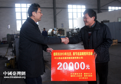 中国台湾网1月28日德阳消息 日前,四川省德阳市拨出专款,对全市困难台资企业和困难台胞台属进行了“送温暖”慰问活动,给企业送去了慰问金,给台属送去了春联、慰问金和新春的祝福,把党委和政府的关怀送到台商和台胞台属心里,是他们在寒冬倍感温暖。