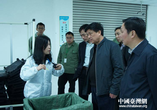 四川省台办主任刘俊杰(中)、巡视员钟远超(左三)一行在纬创成都工厂调研。(图片来源:四川省台办)