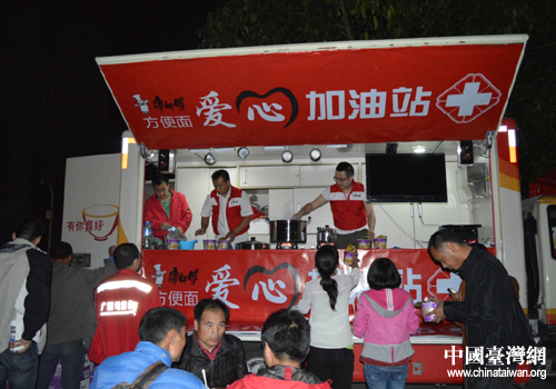 康师傅在芦山县设立“爱心加油站”现场为灾民及救援人员提供烹煮好的热泡面。(图片来源:四川省台办)