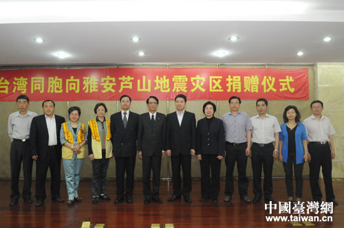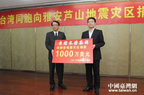 捐赠仪式上,长荣集团捐款1000万美金(约合6170万元人民币),是目前向雅安芦山地震灾区捐款数额最多的台资企业;大润发捐赠1000万元人民币,包括300万元资金和700万元物资;台湾宗教团体佛光山捐款1000万新台币(约合208万元人民币);新光三越百货股份有限公司捐款100万元人民币。四川省副省长甘霖出席捐赠仪式,并代表四川省人民政府接受台湾同胞捐赠。