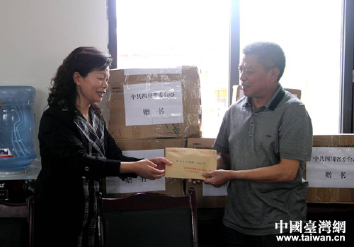 四川省台办巡视员杨永培(左)代表省台办机关党委向李冰村党支部捐赠党费和图书。(图片来源:四川省台办)