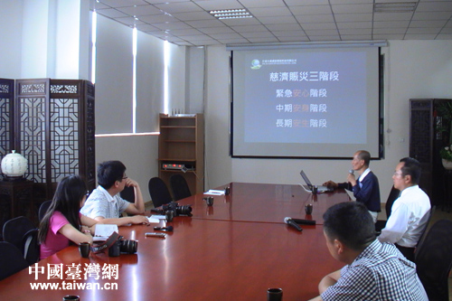 志工陈哲霖向记者介绍台湾慈济会对川援建情况。(德阳市台办 尹显斌 摄)