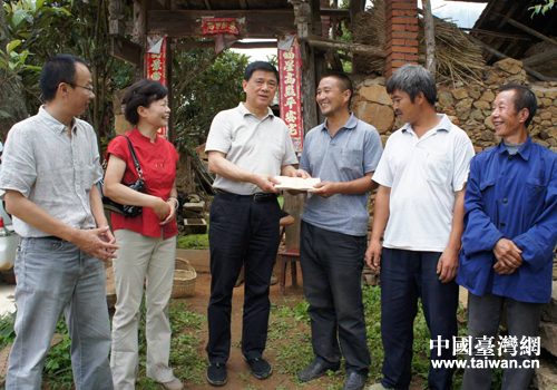 四川省台办主任刘俊杰(左三)代表省台办、省台联为泸定县德威乡海子村20户贫困户和村支部送去慰问金。(图片来源:四川省台办)
