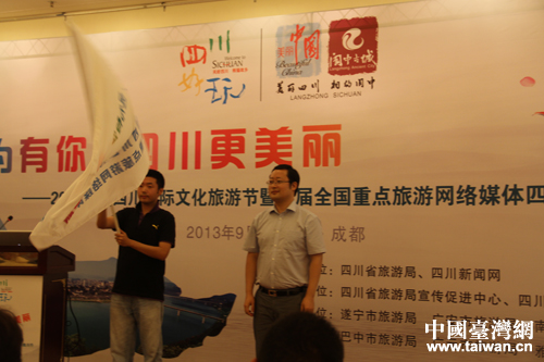 中共四川省委宣传部网宣处副处长郑伟强先生向媒体代表授旗。(中国台湾网 樊玉娇 摄)