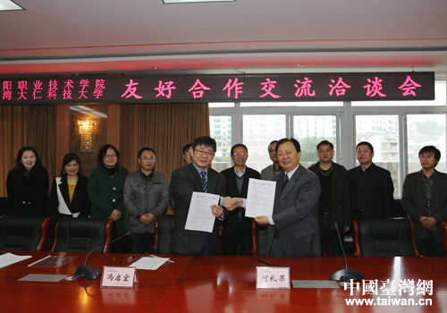 中国台湾网11月7日绵阳消息 日前,台湾大仁科技大学两岸事务处处长冯启宏博士一行前往绵阳职业技术学院开展参访交流活动,两校就深入开展学科领域的科研合作、师生互访、教材编纂等方面的学术交流签署了合作备忘录。绵阳职业技术学院党委书记文晓璋,党委副书记、院长何礼果,党委常委、副院长肖争鸣出席交流座谈会和合作备忘录签署仪式。