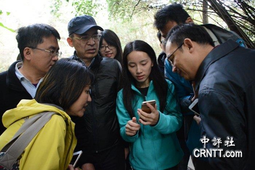 中评社采访团在成都大熊猫繁殖研究基地,围着解说员看繁殖纪录。(中评社 赵家麟摄)