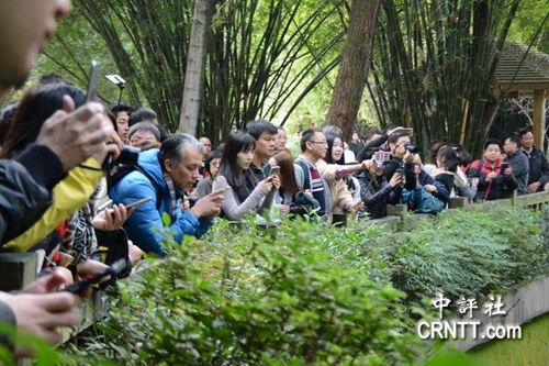 成都大熊猫的一举一动,吸引无数观光客的目光。(中评社 赵家麟摄)