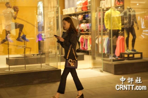 成都太古里,打扮时尚的女子走过精品店。(中评社 黄文杰摄)