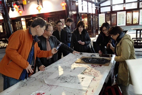 萧百兴(左一)一行体验绵竹年画制作副本