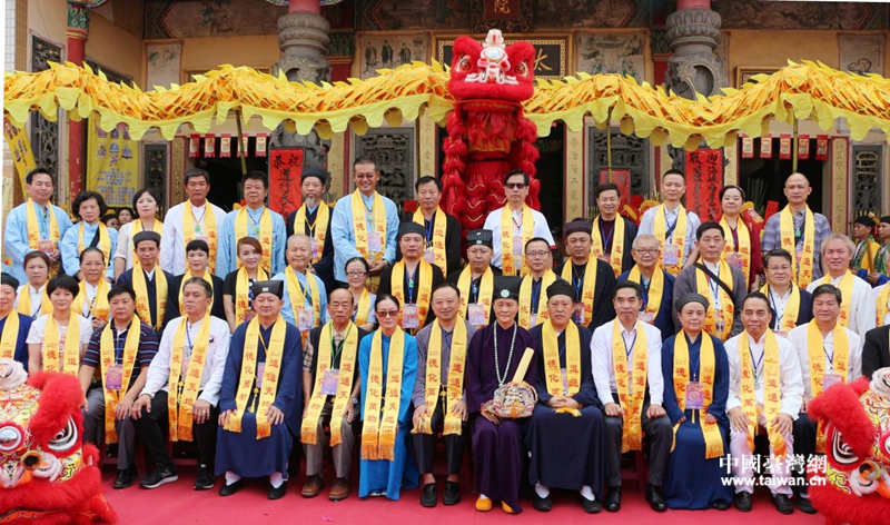 高雄道德院住持太乙宗师翁太明、四川省道教协会会长唐诚青与参与法会团体合影。(《台湾导报》记者李鸣盛拍摄)