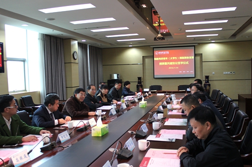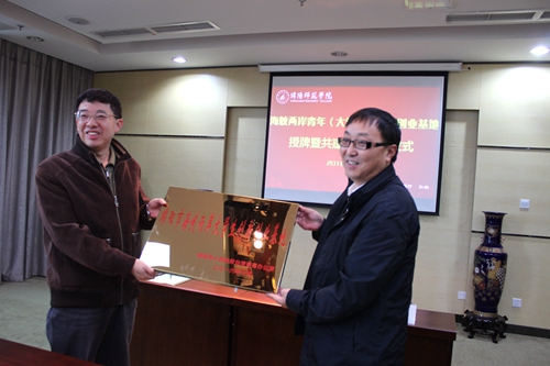 绵阳市台办向绵阳师范学院授牌“绵阳市海峡两岸大学生创新创业基地”仪式在绵阳师范学院举行。(左为绵阳台办主任陈福林、右为绵阳师范学院院长王海滨)