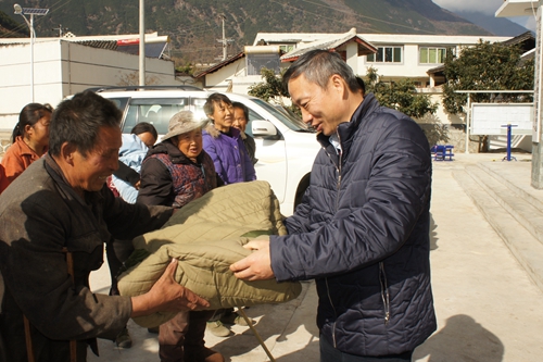 四川省台办主任周敏谦(右)慰问海子村贫困户并送上御寒物品