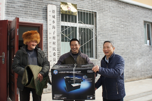 四川省台办主任周敏谦(右)代表省台办向海子村活动中心送上文印传真一体机