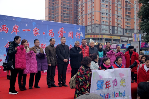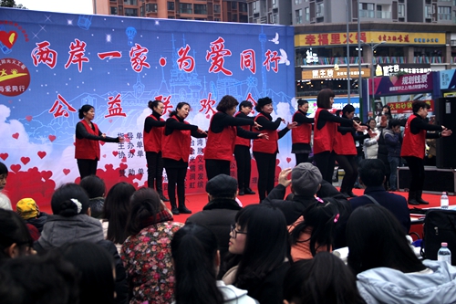 中国台湾网12月30日绵阳讯 12月24日,绵阳大润发超市门前的长虹国际广场上人头攒动,热闹非凡,由绵阳市台办指导,绵阳市台商协会主办,绵阳市台胞台属联谊会、微爱阳光义工联儿童希望基金会协办的“两岸一家·为爱同行”主题公益联欢活动在此举行。活动参与者近百人,观看民众达千人。