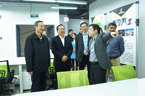四川省台办主任周敏谦(左一)在“亚台青(成都)海峡青年创业园”调研