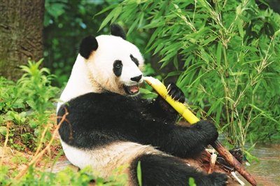 大熊猫“汪佳”正在啃食竹笋。