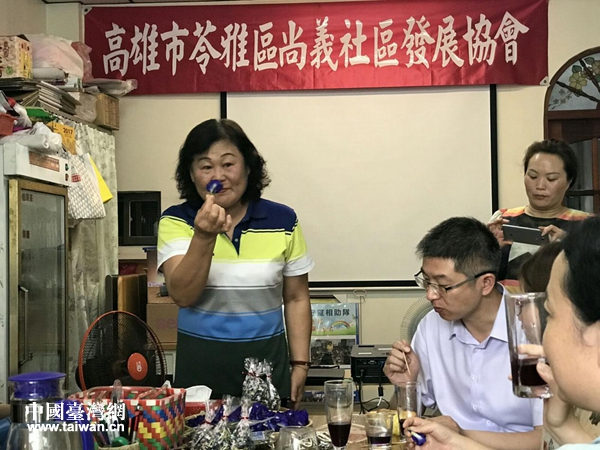 品尝社区自制的蝶豆花茶和酵素茶。(图片来源:绵阳市台办)