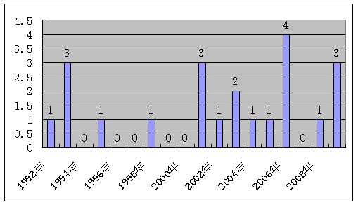 从台资企业落户眉山的时间来看,最早于1992年台胞曾再发在眉山投资开办谊园园林绿化有限公司开始,18年间有12个年头每年都有台资企业落户,台资企业入驻眉山的最高峰时段集中在2006年,落户了4家。投资额在3500万元以上的7家台企除眉山统一企业有限公司落户于1993年,东坡区大亨餐厅落户于1995年外,其余5家均为2001年眉山建市后落户。如图: