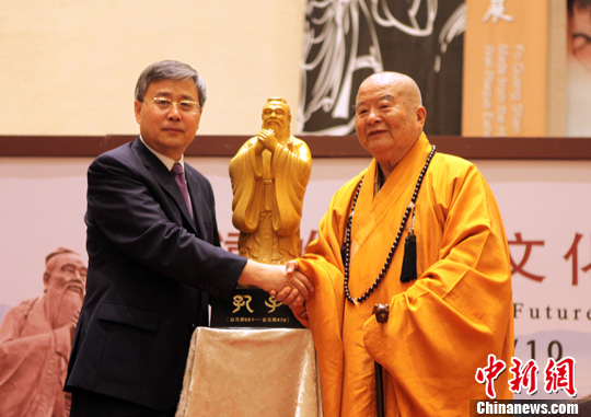 10月31日,正率团在台湾参访的山东省省长郭树清31日到高雄佛光山参访,同时参观由山东省文物局、佛光山佛陀纪念馆主办的“永远的孔子——走进衍圣公府”特展。图为郭树清向星云法师致赠孔子像。陈立宇 摄