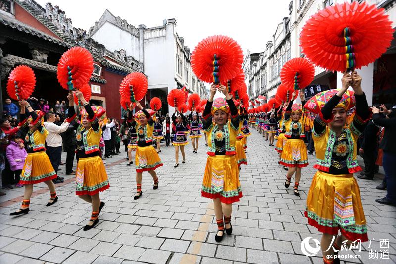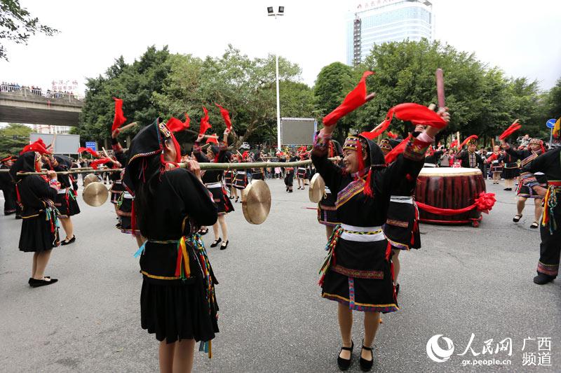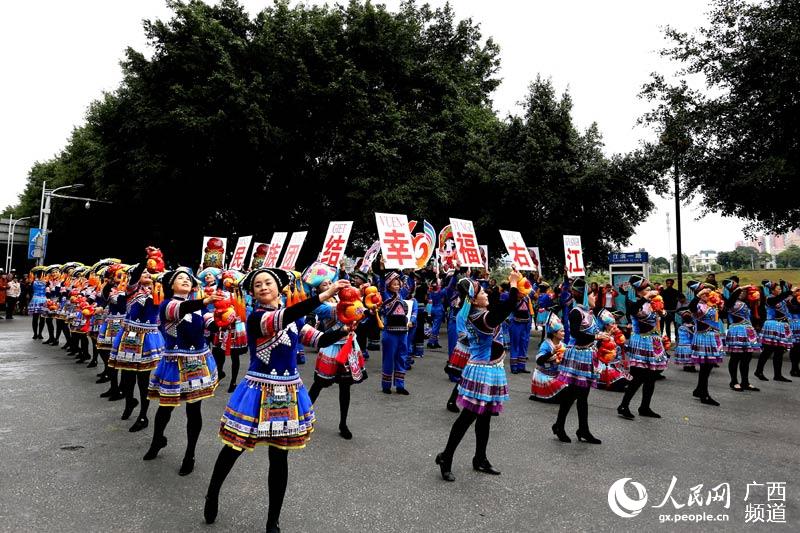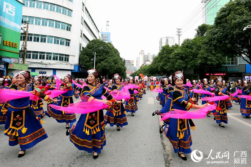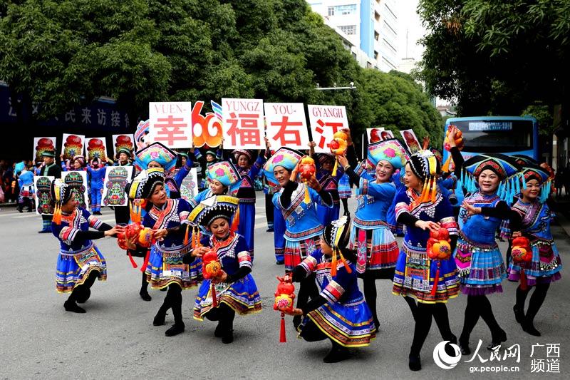 人民网百色12月9日电 12月9日,广西百色市在市区举办“千姿百色·多彩壮乡”民族文化巡游展示活动,来自该市12个县(市、区)的各族群众载歌载舞,喜迎广西壮族自治区成立60周年。(庞革平、陆杰)