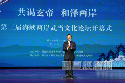 华夏经纬网10月26日讯:25日晚,第三届海峡两岸武当文化论坛在武当山太极剧场举行开幕仪式。出席开幕式的重要嘉宾有海峡两岸关系协会副会长蒋耀平、台湾海峡交流基金会副董事长高孔廉、湖北省第十届政协副主席陈柏槐、中共十堰市委书记周霁。
