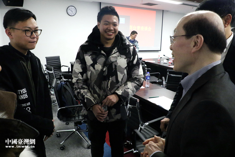 1月16日,中央台办、国务院台办主任刘结一与安徽省合肥市当地台商、台青、台籍师生等各界台胞交流座谈。图为刘结一主任在座谈会后与台湾青年亲切交谈。(中国台湾网 尹赛楠 摄)